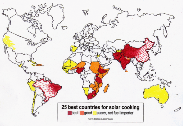 Atualmente o cozimento solar vem se popularizando pelo terceiro mundo onde é predominante o uso da lenha. Estudos da OMS (Organização Mundial da Saúde) mostram que em 23 paises, 10% das mortes são causadas por água imprópria e fumaça de combustiveis sólidos, o que torna extremamente vantajoso o uso do cozimento solar e da pasteurização de água atravéz do sol. Mas no embalo das questões ambientas, o cozimento solar vem penetrando na vida dos mais abastados da socied