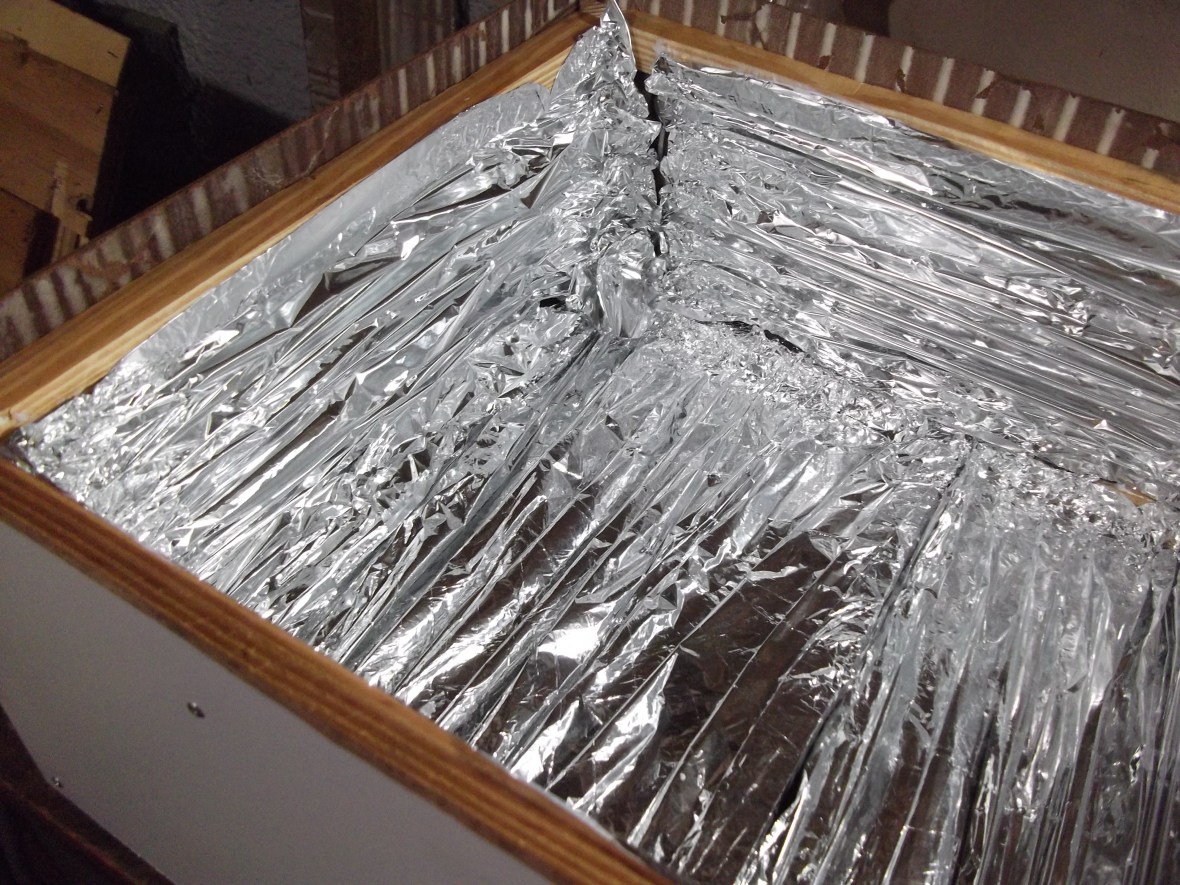 Camadas de folhas de alumínio sanfonada, intercaladas com manta de fibras múltiplas.