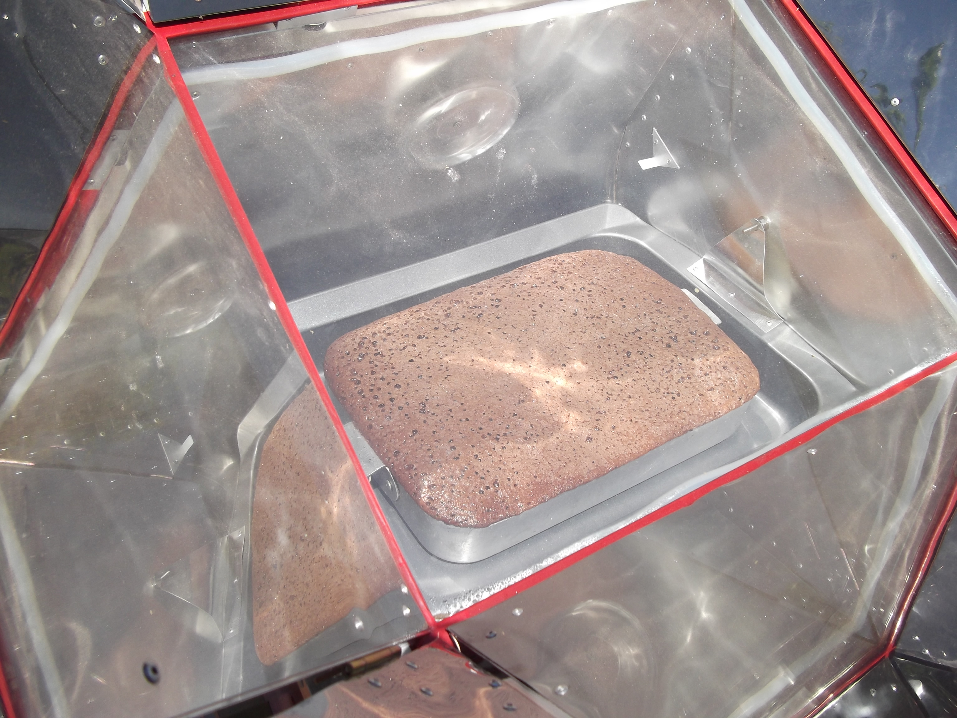 Naturalmente a convecção homogeniza a temperatura interna do Forno Solar mas a tendência do ar quente e do vapor é de se acomodarem na parte superior, com a ventoinha a atmosfera interna é movimentada se chocando com as partes mais quentes do equipamento e com a superfície do alimento acelerando seu aquecimento e formando cada vez mais vapor que tem muito poder calorífico! O choque do vapor contra o alimento além de acelerar o processo permite resultados imprecionantes!