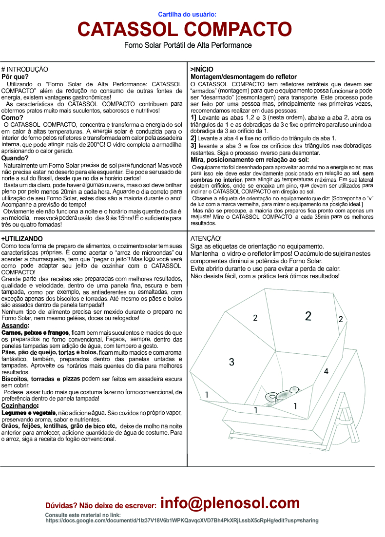 O CATASSOL COMPACTO tem refletores retráteis que devem ser “armados” (montagem) para que o equipamento possa funcionar e pode ser “desarmado” (desmontagem) para transporte. Este processo pode ser feito por uma pessoa mas, principalmente nas primeiras vezes, recomendamos realizar em duas pessoas: 1] Levante as abas 1,2 e 3 (nesta ordem), abaixe a aba 2, abra os triângulos da 1 e as dobradiças da 3 e fixe o primeiro parafuso unindo a dobradiça da 3 ao orifício da 1. 2] Levante a aba 4 e fixe no orifício do triângulo da aba 1. 3] levante a aba 3 e fixe os orifícios dos triângulos nas dobradiças restantes. Siga o processo inverso para desmontar. -Mira, posicionamento em relação ao sol: O equipamento foi desenhado para aproveitar ao máximo a energia solar, mas para isso ele deve estar devidamente posicionado em relação ao sol, sem sombras no interior, para atingir as temperaturas máximas. Em sua lateral existem orifícios, onde se encaixa um pino, que devem ser utilizados para inclinar o CATASSOL COMPACTO em direção ao sol. Observe a etiqueta de orientação no equipamento que diz: [Sobreponha o “v” de luz com a marca vermelha, para mirar o equipamento na posição ideal.] Mas não se preocupe, a maioria dos preparos fica pronto com apenas um reajuste! Mire o CATASSOL COMPACTO a cada 35min para os melhores resultados. |