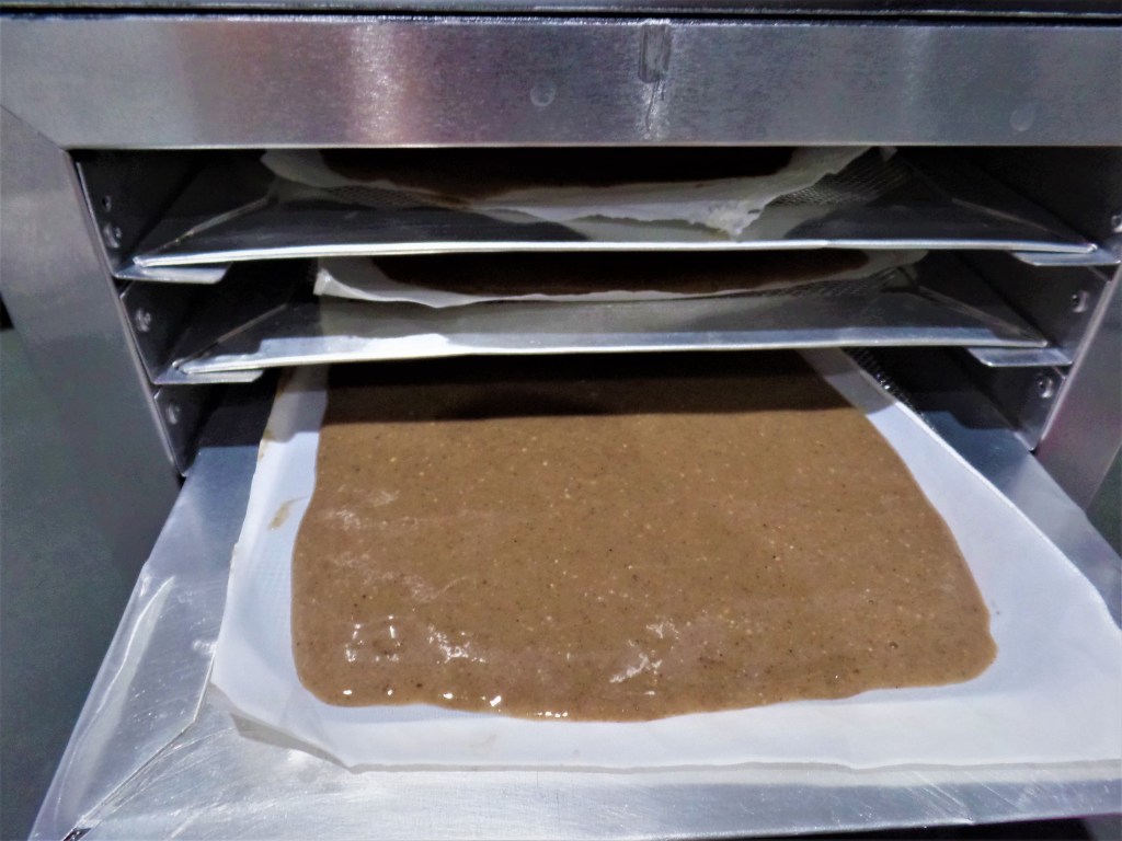 Com uma espatula distribui a pasta de frutas sobre a manta, não se deve fazer uma camada muito fina pois se não vira um papel após desidratado.